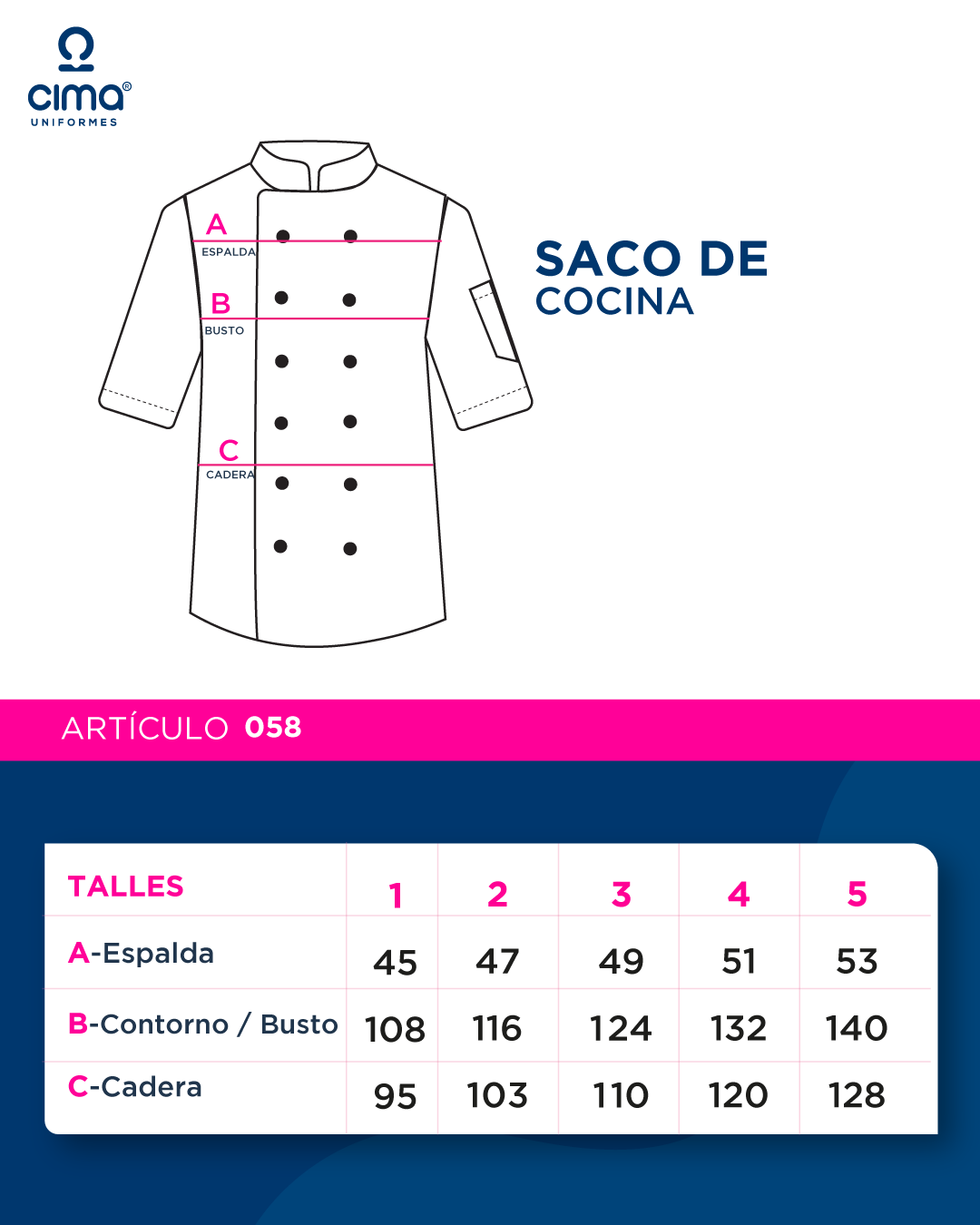 Saco de cocinero cruzado de tela risptop, suave al tacto, de fácil lavado y resistente al uso. Con cuello mao, mangas cortas con dos bolsillos laterales, con botones plásticos y vivos en color gris.